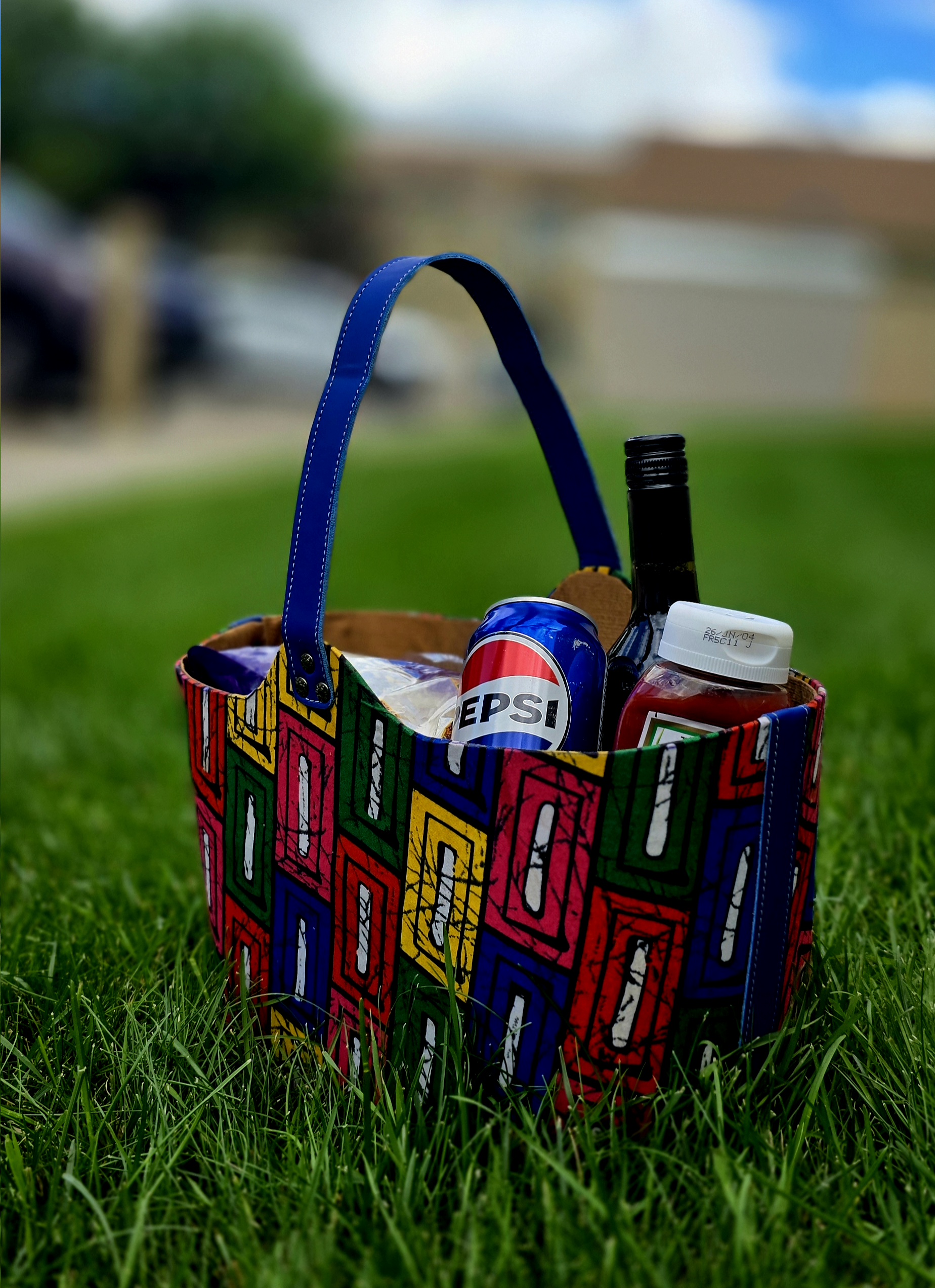 A vibrant multicolor African hamper basket bag made with bold Ankara print and sturdy blue handles. Spacious and perfect for shopping, picnics, or stylish storage.