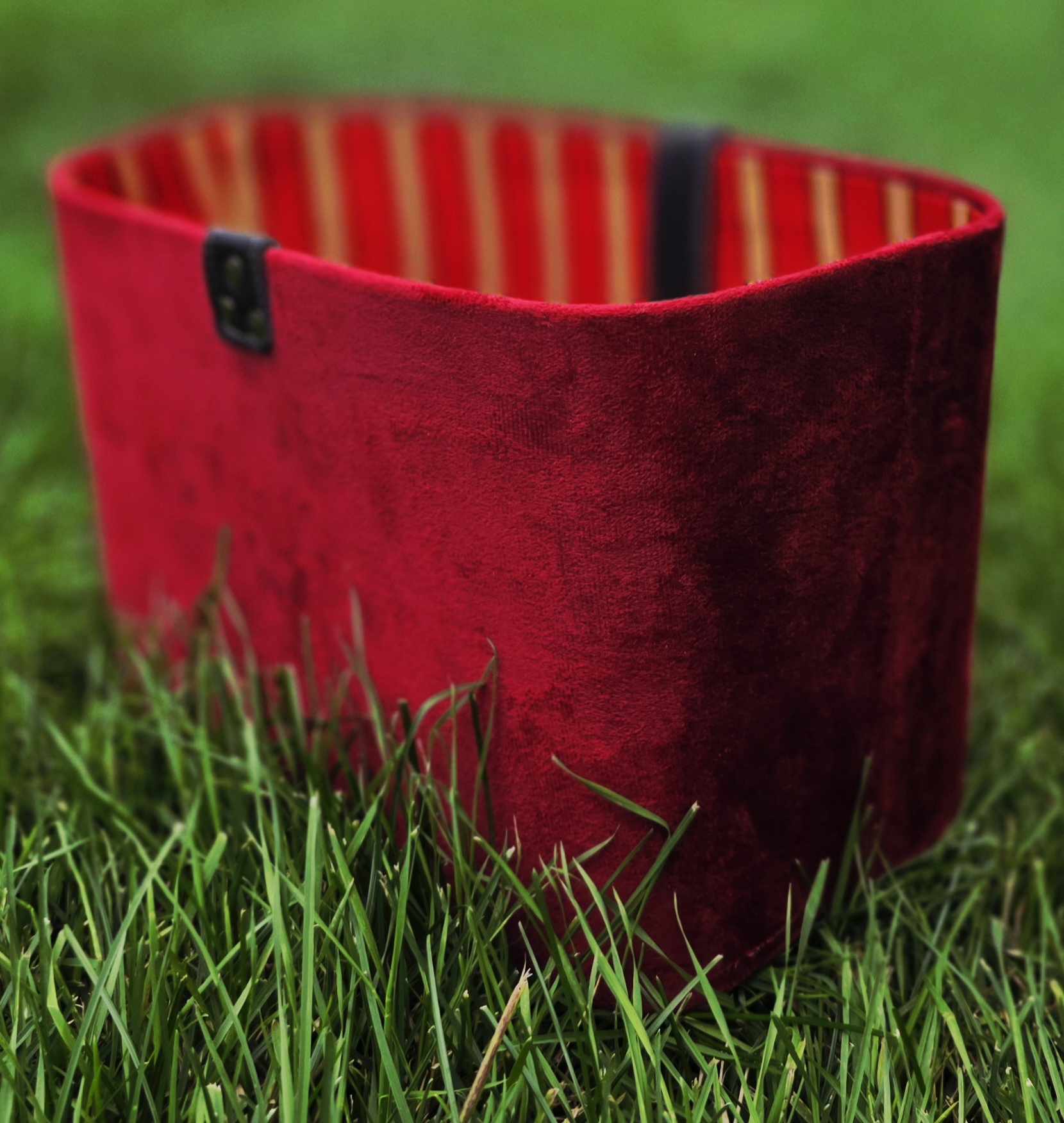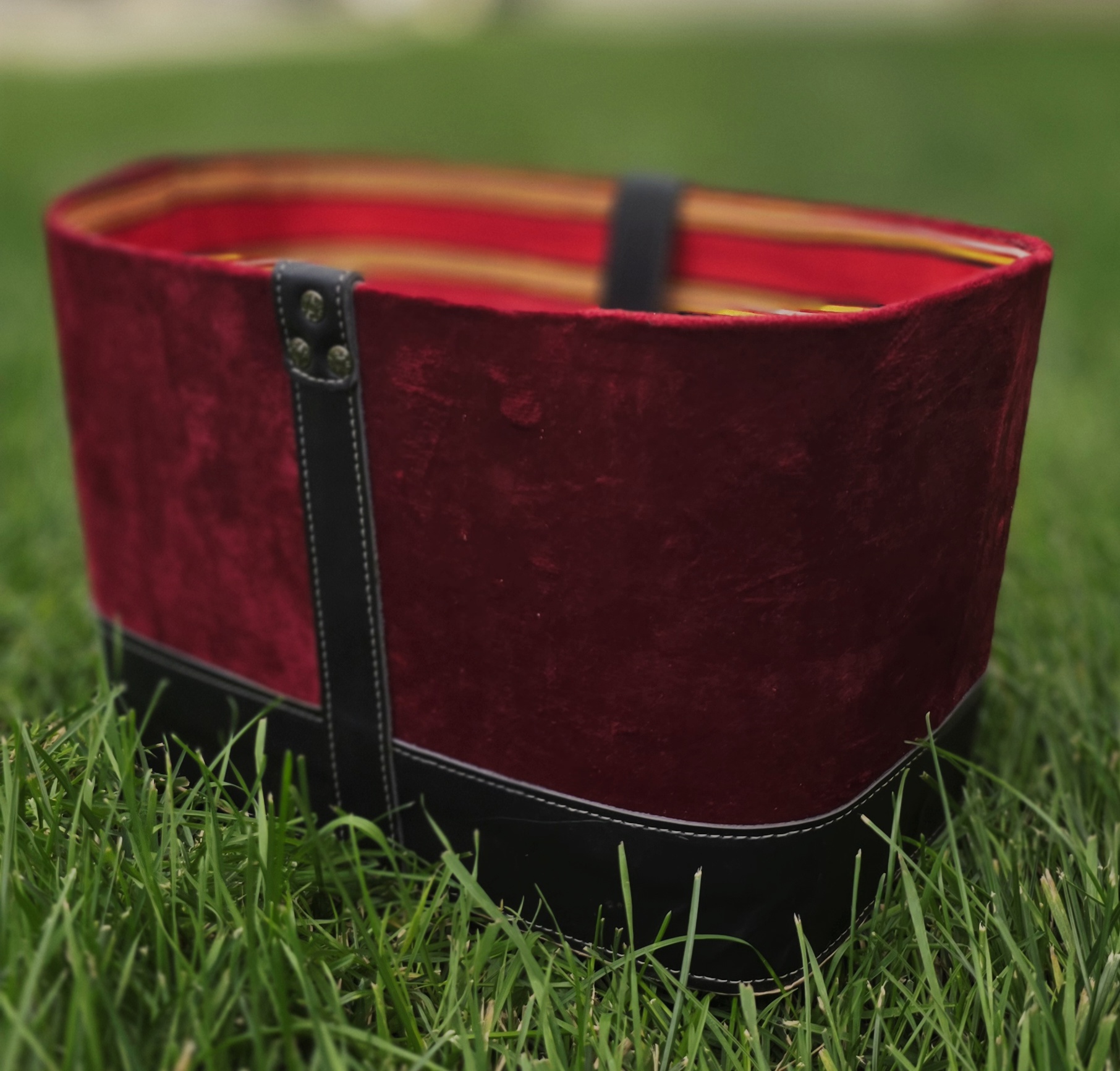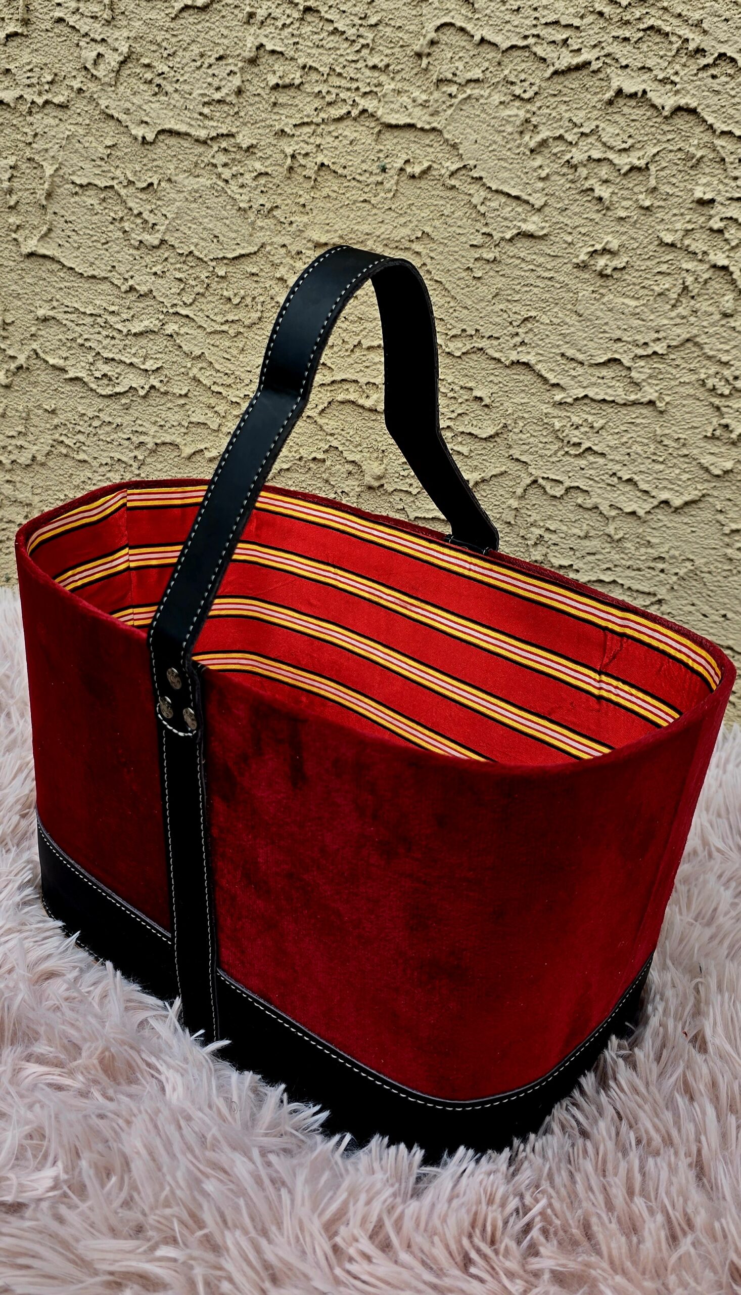 Bring elegance and tradition together with this Red Velvet African Hamper Basket Bag, a statement piece that blends texture, culture, and function. The exterior is crafted from plush red velvet, giving it a soft, luxurious feel, while the inside is lined with vibrant multicolor African stripe Ankara fabric, adding a pop of culture and color.